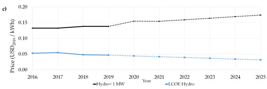 Forecast of reference prices at RES auctions in Poland and LCOE for (a) onshore and offshore wind farms, (b) PV power plants and (c) hydropower plants.