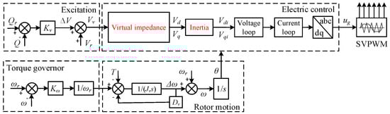 The schematic diagram of the improved VSG control incorporating voltage inertia and virtual impedance is shown in the Figure 2. As shown in the Figure 2, the voltage is obtained by the excitation block, and the angle frequency is obtained by the torque governor block and rotor motion block. The virtual impedance obtains the voltage to generate the voltage reference signals of the dq-axis ( and ). According to the second-order inertia, the voltage reference signals and are changed to the new voltage reference signals and . The phase angle can achieve the coordinate transformation, and use PI control strategy to control the voltage loop and the current loop.
