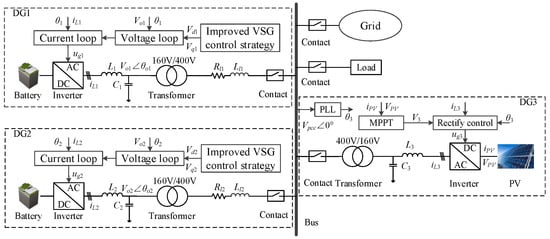 The connection model of the microgrid is shown in the Figure 3. In the Figure 3, it comprises batteries based DG units (DG1 and DG2), a photovoltaic based DG unit (DG3), a grid, and a load. (, 2) is the output voltage of the DG unit, and represents the voltage at the common coupling point. and (, 2, 3) are the filter inductors and filter capacitors, respectively. (, 2) is expressed as line resistance and (, 2) is expressed as line reactance. The DG3 adopts the rectifier controller [25], and it is a good method to get the reference voltage through maximum power point tracking (MPPT) [26].