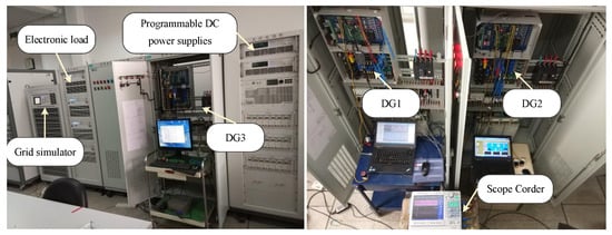 In order to verify the feasibility of the improved VSG control, the corresponding experimental platform is established, which is shown in the Figure 4. In the Figure 4, the experimental platform comprises programmable DC power supplies, Scope Corder, three sets of DG units, an electronic load, and grid simulator, and the control strategies of the DG units are implemented by the TMS320F2812 controller. Meanwhile, the parameters of the experimental platform are the same as those of the connection model.