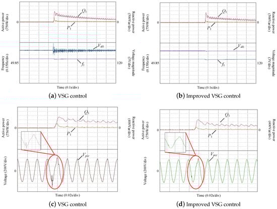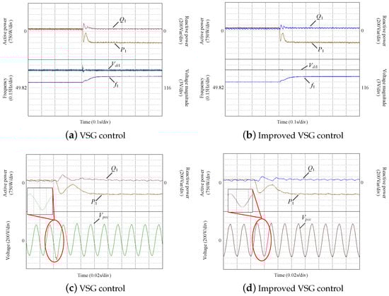 When the transformer load is loaded, the voltage, frequency, and power waveforms of the DG1 are shown in the Figure 6. As shown in the Figure 6a, the voltage reference signal of the VSG control changes immediately when the transformer load is loaded, and its maximum overshoot is over 3%. As shown in the Figure 6b, when the transformer load is loaded, the overshoot of the voltage signal is less than the overshoot under VSG control, which is less than 1.1%, and the high frequency noises of the voltage reference signal can be filtered out. As shown in the Figure 6c, there is a large distortion of when the transformer load is loaded. The THD of is approximately 3.43%. As shown in the Figure 6d, when the transformer load is loaded, the value of the distortion of DG1 under the control of the improved VSG is smaller than the value under the control of the VSG. And the THD of is approximately 2.62%, which is smaller than that under the VSG control.
