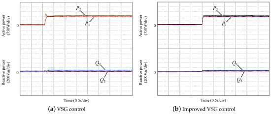 When the DG unit has a load and is in parallel operation, the waveforms of active power ( and ) and reactive power ( and ) are shown in the Figure 7. The circulating current of active power when adopting VSG control and adopting modified VSG control, the values are 55 and 47 W, respectively. The reactive power of the microgrid is 30 Var and 26 Var, respectively, when using VSG control and when using improved VSG control. When the resistive load increases suddenly, the power overshoot of DG2 controlled by VSG is greater than 9%, which is greater than the maximum power overshoot of DG2 when the recommended control is adopted.