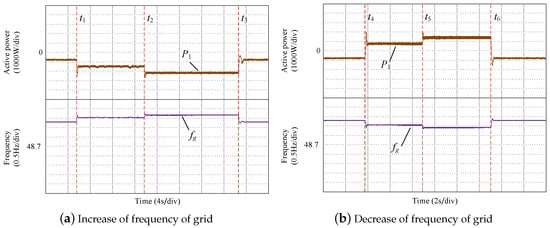 Figure 8 in this article shows the active power and frequency waveform of the proposed control DG1 when the frequency increases or decreases.It can be seen from Figure 8a that when the frequency of the grid increases from 50 to 50.2 Hz, the absorbed active power of DG1 first decreases to over −2500 W, but immediately returns to −1560 W. Then when the frequency of the grid increases from 50.2 to 50.3 Hz, the active power of DG1 can be quickly adjusted to about −2160 W. Finally, when the frequency is reduced from 50.3 to 50 Hz, the active power of DG1 can be immediately increased to −900 W. When the frequency is basically unchanged, the fluctuation of the active power is small. It can be seen from Figure 8b that when the frequency is reduced from 50 to 49.7 Hz, the injected active power of DG1 will first increase to 3000 W, but immediately return to 1910 W. Then when the frequency is reduced from 49.7 to 46.65 Hz, the active power speed of DG1 increases to 2430 W. Finally, when the frequency increases from 49.65 to 50 Hz, the active power of DG1 is reduced to −900 W. It can be obtained that when the frequency is basically unchanged, the fluctuation of the active power is small.