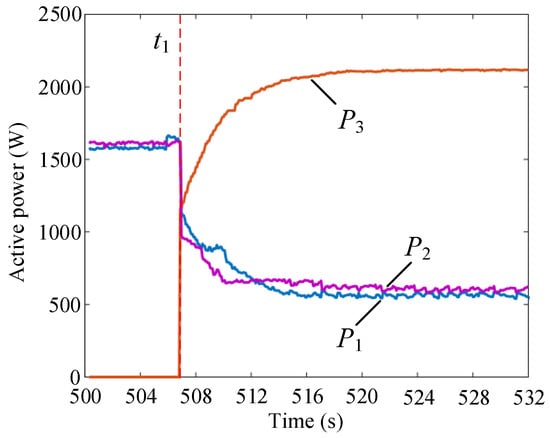 The waveform of the output active power of Case 1 is shown in the Figure 9. Among them is the output active power of DG units (, , and ). It can be seen from the Figure 9 that when t , the active power of DG1, DG2 and DG3 drop from about 1580 to 551 W, from about 1615 to 606 W, and from 0 W to about 2100 W. When DG3 is connected to the microgrid, the maximum overshoot of the active power of all DG units is less than 0.9%.