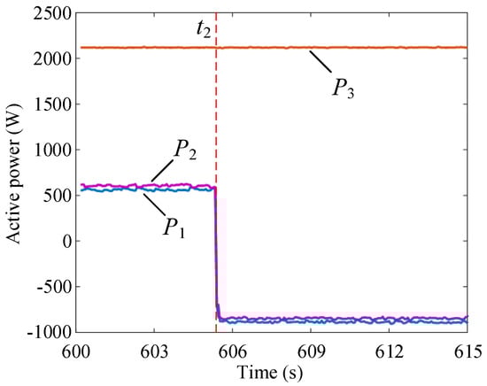 The waveforms of the output active power at Case 2 are shown in the Figure 10. When load shedding occurs at t , the active power of DG1 is reduced from approximately 551 W to −884 W, the active power of DG2 is reduced from approximately 606 W to −856 W, and the active power of DG3 is unchanged. When load shedding occurs, the overshoot of active power of DG1 and DG2 is smaller than 0.9%, and the operation state of DG3 is almost unchanged in this condition. Meanwhile, the active power fluctuations of all DG units are very small when the microgrid operates in steady state.