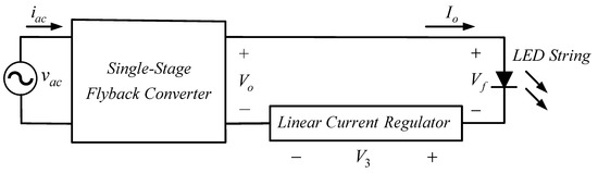 Therefore, how to reduce LED flickering is a research issue in this paper. The literature [10] presents a comprehensive experimental-based labeling methodology for comparing LED performance with reference to light flicker and power factor. The literature [11] presents an auxiliary circuit with battery powering, and by controlling this circuit, a current opposite to the low-frequency current ripple is generated to suppress such a current ripple. The literatures [12,13] adopt the three-phase voltage along with the power factor correction (PFC) to decrease the low-frequency current ripple. The literature [14,15] employs some auxiliary circuits, which will generate energy via different paths and transfer this energy to the output so that the low-frequency current ripple can be inhibited. The literature [16,17] also utilizes the third-order harmonic injection so that the input power pulsation will be smoothed; hence, the low-frequency current ripple can be alleviated, but the corresponding power factor (PF) is degraded. Furthermore, the literature [18,19] employs the valley-fill circuits, which will change the turn-on angle between the input instantaneous power and the input current, so that the low-frequency current ripple can be reduced. However, the above-mentioned methods have a common default of circuit complexity and design difficulty. Consequently, in this paper, a single-stage AC–DC flyback LED driver, together with a linear current regulator having the bipolar junction transistor (BJT) whose power dissipation is only linearly proportional to the LED current, is employed so as to decrease LED low-frequency flicker significantly with PF and total harmonic distortion (THD) slightly influenced. In addition, amplitude dimming from 100% to 10% is adopted herein.