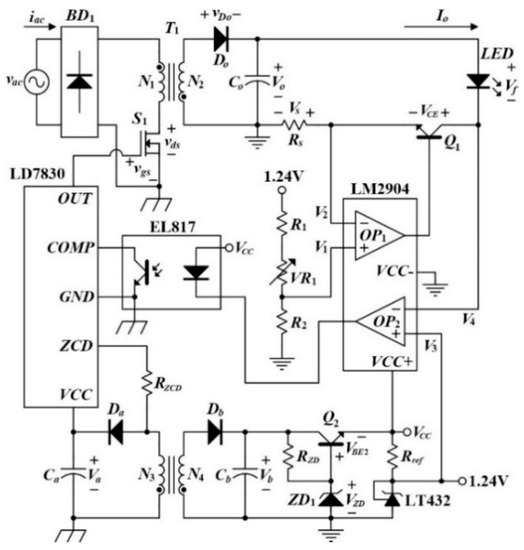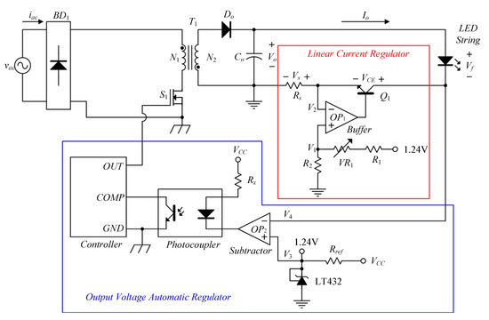 Figure 1 displays the system block diagram for the proposed LED driver, and Figure 2 briefly illustrates its overall system. Figure 2 shows the proposed circuit with the input voltage vac and the input current iac before the bridge diode BD1. This circuit contains three subsystem blocks. The first subsystem block is the main power stage constructed by one single-stage flyback converter with the transformer T1 having the primary turns of N1 and the secondary turns of N2. The second subsystem block is the linear current regulator along with a dimming function built up by one operational amplifier OP1 used as a buffer with the voltage V1 at the non-inverting input terminal and the voltage V2 at the inverting input terminal, one BJT Q1 operating in the linear region, one current-sensing resistor Rs, and three voltage-dividing resistors R1, R2, and VR1, whose value can be adjustable. The third subsystem block is the output voltage automatic regulator established by one operational amplifier OP2 used as a subtractor with the voltage V3 at the non-inverting input terminal and the sensed voltage V4 at the inverting input terminal, one adjustable precision shunt regulator TL432 providing one reference voltage V3 of 1.24 V via the circuit voltage VCC, one photocoupler, one controller, and two current-limiting resistors Rx and Rref. Furthermore, the voltages Vo, Vf, and Vs indicate that the output voltage of the flyback converter, the equivalent forward voltage of the LED string, and the voltage across Rs, respectively. In addition, the voltage V2 is equal to the voltage V1 based on the virtual ground, and the current Io is the current flowing through the LED string.
