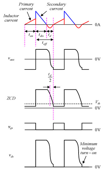 The waveforms shown in Figure 3 are used to understand the basic operating principle of the CRM PWM control for the single-stage PF flyback converter. From Figure 3, as soon as the zero current at the secondary is from the positive current to zero, the resonance occurs between the primary inductance and the parasitic capacitance of the main switch. Hence, the current at the primary goes to the negative. As soon as such a current goes to zero, the accompanying voltage on the main switch resonates to the minimum value. At this moment, the main switch is turned on with NZVS, and this is achieved by the auxiliary winding. As seen in Figure 3, the voltage on the auxiliary winding is almost the same as that on the main switch except for the amplitude. Therefore, the zero current detection signal, called ZCD, is attained and compared with a fixed threshold voltage inside the CRM PWM integrated circuit (IC); hence, the resulting gate-driving signal vgs is activated.