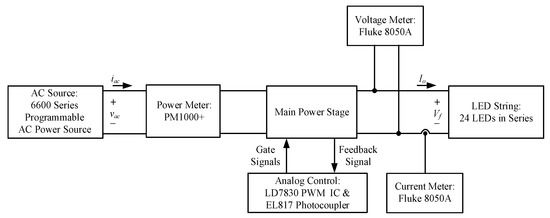 The setup used to measure the efficiency will be briefly described. First, as shown in Figure 5, the values of input power, PF, and THD can be obtained from the power meter. Regarding the output power, the output current is read from a current meter, and the output voltage is read from another voltage meter. Therefore, the output power can be attained. Finally, the efficiency is deduced from those two measurements.