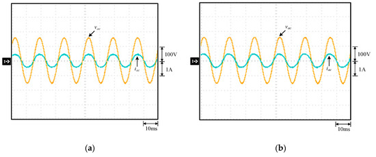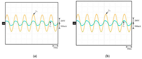 Waveforms under 220 V input voltage and 100% output load: (a) without; (b) with the proposed low-frequency current ripple improved: (1) vac; (2) iac.