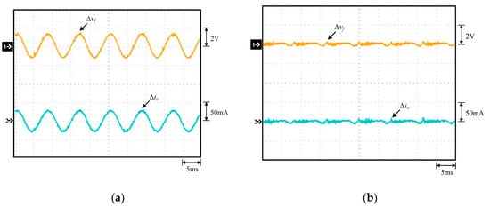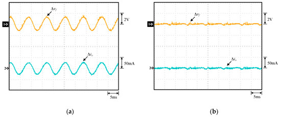 Waveforms under 220 V input voltage and 100% output load: (a) without; (b) with the proposed low-frequency current ripple improved: (1) Δvf; (2) Δio.