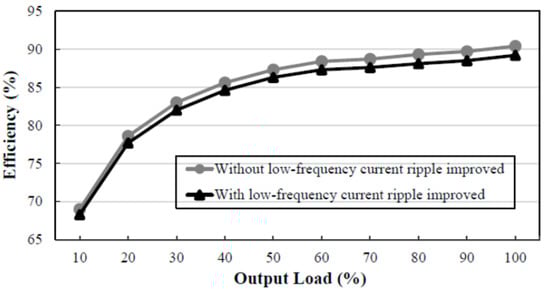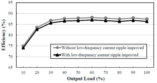 Efficiency curve: Figure 11 shows curves of efficiency versus output load without and with the low-frequency current ripple improved at the input voltage of 110 V, whereas Figure 12 shows curves of efficiency versus output load without and with the low-frequency current ripple improved at the input voltage of 220 V. From these two figures, the efficiency with a low-frequency current ripple improved is lower than that without a low-frequency current ripple improved by 1.2%. From these two figures, the efficiency at 100% output load with the current ripple improved is 86.3% at the input voltage of 110 V, whereas the efficiency at 100% output load with the low-frequency current ripple improved is 89.2% at the input voltage of 220 V.