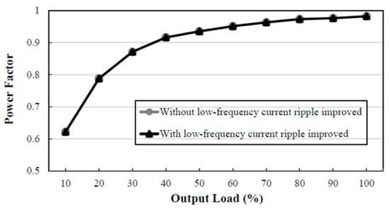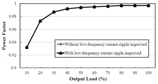 Power factor curve: Figure 13 shows curves of the power factor versus output load without and with the low-frequency current ripple improved at the input voltage of 110 V, whereas Figure 14 shows curves of the power factor versus output load without and with the low-frequency current ripple improved at the input voltage of 220 V. From these two figures, the power factor with the low-frequency current ripple improved is almost the same as that without the low-frequency current ripple improved. From these two figures, the power factor at 50% output load with the low-frequency current ripple improved is 0.994 at the input voltage of 110 V, whereas the power factor at 50% output load with the low-frequency current ripple improved is 0.935 at the input voltage of 220 V.