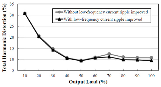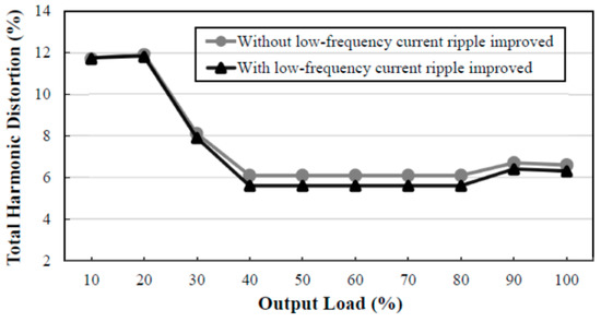 Figure 15 shows curves of total harmonic distortion versus output load without and with the low-frequency current ripple improved at the input voltage of 110 V, whereas Figure 16 shows the curves of total harmonic distortion versus output load without and with the low-frequency current ripple improved at the input voltage of 220 V. From these two figures, the total harmonic distortion with the low-frequency current ripple improved is slightly lower than that without the low-frequency current ripple improved. From these two figures, the total harmonic distortion at 50% output load with the low-frequency current ripple improved is 5.6% at the input voltage of 110 V, whereas the total harmonic distortion at 50% output load with the low-frequency current ripple improved is 9.4% at the input voltage of 220 V.