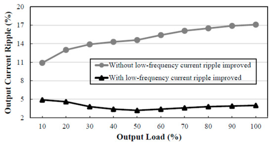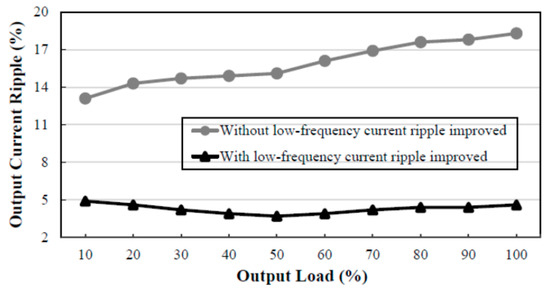 From Figure 17 and Figure 18 and Table 4 and Table 5, it can be seen that with the low-frequency current ripple improved, the output current ripple at 100% output load is lower than that at 10% output load. As compared with the output current ripple percentage without a low-frequency current ripple improved, the output current ripple percentage with the low-frequency current ripple improved can be reduced by a factor of about four at 100% output load and by a factor of about two at 10% output load. From these two figures, the maximum value of the output current ripple percentage with the low-frequency current ripple improved is 4.9%.