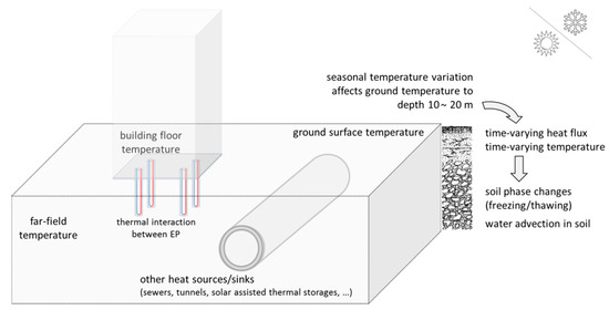 It is essential for the accurate estimation of the cyclic heat accumulation and heat extraction potential of SGES to consider proper boundary conditions. Particularly, the seasonal thermal storage and the additional interference between SGES ground surface boundary and the building floor temperature conditions must be considered, to avoid an unbalanced operation of SGES [102]. Such impacts might be less significant in case of deep BHEs, because only the depth near the ground surface is penetrated by the ambient surface temperature variations, and the ground surface boundary is usually modeled as adiabatic. Consideration of seasonal ground surface temperature variation becomes essential in case of shallow EP, whose whole length might lay within this climate-affected subsurface layer [78]. In general, seasonal temperature fluctuation affects ground surface temperature to the depth of 10–20 m. This surface temperature fluctuation can be modeled either as a time-varying temperature (i.e., a Dirichlet condition), or as a time-varying heat flux (i.e., a Neumann condition) [5,12]. Additionally, alternative boundary conditions must be considered in case of SGES interaction with other heat sources or heat sinks that may exist in the ground in urban areas between buildings, sewers, tunnels, etc.