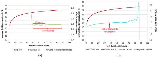 Finally, regarding estimation procedure evaluation, the so-called sequential forward evaluation [121] starts from the test data start time point or from another known point and goes stepwise forward in time. Thus, the last (in the time series) point of the resulting curve of the thermal conductivity estimates (see Figure 3a) is the resulting estimated value. The forward-convergence curve requires the use of the minimum time criterion at the beginning of the test. In an analogous manner, the sequential backward evaluation is carried out going stepwise backward (see Figure 3b).