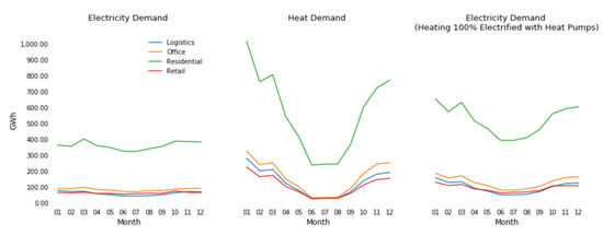 Aggregated energy consumption of all buildings generated by the energy model was compared to Helen Ltd.’s actual production numbers for the year of 2019 [33]. Helen Ltd. provides district heating for Helsinki, covering over 90% of heat demand in the city. Last year, Helen delivered 6556 GWh of heat, and the model predicted 6514 GWh (difference of 0.6%). Helen also distributes electricity; for building electricity, 4164 GWh was distributed, and the model predicted 4124 GWh (difference of 1.0%). The model seems quite robust, at least for aggregate numbers. Figure 2 presents monthly electricity and heat demand for the HMA as well as electricity demand in a scenario where heating is 100% electrified with heat pumps (using 3.5 as the average coefficient of performance, COP). Even though this paper focuses on electricity, heating and its electrification are included, as many carbon-neutral pathways propose electrification of heating as a solution for carbon neutrality. In these scenarios, such as [1], on-site heat pumps a have significant role in delivering the required heating, as pointed out in Figure 1. Therefore, a larger building electricity consumption increases the significance of this paper’s findings.