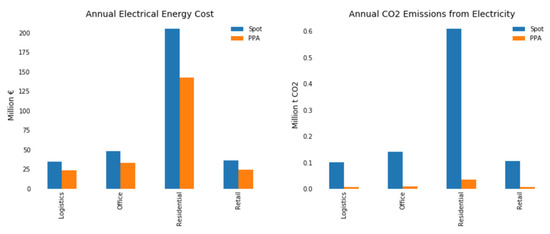 Figure 3 presents a cost comparison between Nordpool spot and a 33 €/MWh wind PPA contract for the whole building stock of the HMA divided into the four major property types. The PPA cost is calculated using Equation (1), but is 33 €/MWh for every hour. The figure also presents CO2 emissions, where 141 kg CO2 per MWh has been used as average for the current electricity [34] and 8 kg CO2 per MWh for onshore wind [35]. For the year of 2019, electrical energy costs would be reduced by 31% and emissions by 94% under a wind PPA agreement. According to Nordpool’s long-term monthly data, the average spot price in Finland has been 40.6 €/MWh for 2010–2019 and 36.6 €/MWh for 2000–2019, higher than the potential PPA price in the long-term.