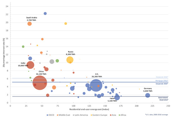 Techno-economic potential of real-estate-backed power purchase agreements in different countries. Bubble sizes represent total energy demand per country, and location of the bubble represents economic viability of real estate PPA, lower mortgage rates indicating lower financing costs and higher end-user energy costs indicating higher motivation for fixing energy costs. Average US data put the country-level risk and potential into perspective, government bond representing cost of finance for feed-in-tariffs and corporate AAA representing cost of finance for a low risk corporate PPA that is nearly the same level as average US mortgage.