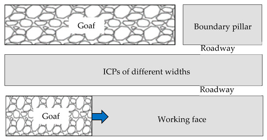 Layout diagram of isolated coal pillars (ICPs). A mining design using ICPs with different widths between neighboring working faces is preferred.