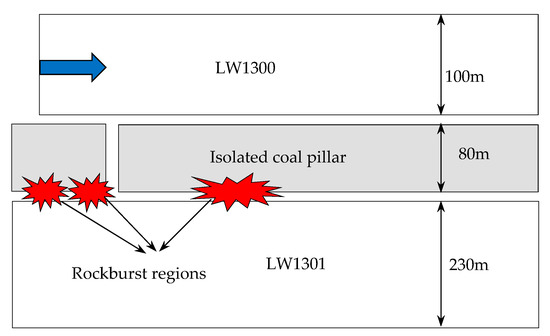 With the continuous reduction of shallow coal resources, a large number of mines have gradually commenced deep mining. He et al. [1] simulated the stress change and obtained insight into the pillar burst phenomenon under laboratory conditions, and they pointed out that the pillar burst was one type of rockburst that occurs in underground mines. Lu et al. [2] investigated the microseismic multiparameter characteristics of rockburst hazard induced by hard roof fall and high stress concentration, and they believed that abnormal clusters of sources and high-energy events congregate before rockburst. Konicek et al. [3] measured the stress at different mining stages by compact conical-ended borehole monitoring (CCBM), indicating the energy-storing characteristic (prone to burst/bump) of the coal seam. He et al. [4] investigated the mechanisms and prevention of rockburst and proposed that the steeply inclined and extremely thick coal seams under the condition of gob filling frequently suffer from the occurrence of rockbursts. Wang et al. [5] discovered that a special thick coal seam with complex construction easily led to rockburst during mining. Li et al. [6] found that rockburst was one of the dynamic disasters that can occur during coal mining, noting that it generally resulted in disastrous consequences and posed serious threats to mine health and safety. Bräuner [7] studied the rockbursts in coal mines and their prevention and proposed the conditions of occurrence. He et al. [8] discovered that when gob-side entry retaining was used in thick coal seams, the conventional entry retaining method requires a huge amount of filling materials and may cause entry accidents. The studies mentioned above prove that the mine dynamic disasters caused by the movement and breaks of overlying strata, such as mine seismicity and rockburst, have occurred more frequently and intensively, which has become a problem in China that desperately needs to be solved. At present, isolated coal pillars (ICPs) with different widths are preferred in the mining design with the purpose of avoiding mutual mining disturbances between neighboring mines [9,10], as shown in Figure 1. However, widths that are too small easily induce dynamic disasters, such as rockburst, while widths that are too large are likely to result in a waste of coal resources.