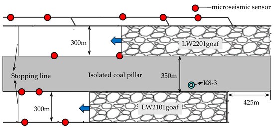 Yingpanhao Coal Mine in Inner Mongolia is a newly built mine. The mine initially plans to mine the #2 coal seam with an average depth of 720 m, near the horizontal coal seam. The coal thickness varies from 5.64 to 7.03 m, with an average thickness of 6.40 m. The uniaxial compressive strength (UCS) is 21 MPa. At the initial stage of mine construction, the 21 and 22 mining areas are planned to be mined. In order to avoid mutual mining disturbance between the two mining areas and reduce the rockburst risk on the working face, a 350 m wide ICP is left between the 21 and 22 mining areas. The north side of the ICP is the 2201 longwall working face (LW2201), the first mining face of the 22 mining area; the south side is the 2101 longwall working face (LW2101), the first mining face of the 21 mining area. LW2201, with a length of 2502 m and a width of 300 m, began to be mined on 3 March 2017; LW2101, with a length of 2077 m and a width of 300 m, began to be mined on 1 December 2017. A 425 m offset was initially kept for the two faces; for both faces, the fully mechanized coal mining method was adopted and full-seam mining was achieved. To reduce the rockburst risk on the working face, large-diameter pressure-relief boreholes with a 150 mm diameter, a 1 m spacing, and a 20 m hole depth were applied to the sides of roadway. By 7 October 2018, the average footage of LW2201 was 1518 m, and that of LW2101 was 1449 m. The layout of the two working faces is shown in Figure 3. This mine adopted an SOS microseismic monitoring system, which was developed in Poland and has been widely applied in coal mines in China [30].