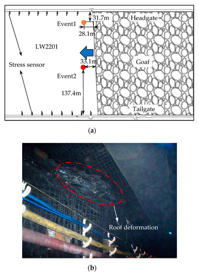 On 7 October 2018, two MS events occurred on the LW2201 during the mining process, and the observed waveforms are displayed in Figure 4. In the figure, Pp and Pk are the arrival time and end time of the P-wave, respectively, while Sp and Sk are the arrival time and end time of the S-wave, respectively. According to the arrival time and particle vibration velocity in the waveforms, the SOS microseismic monitoring system analysis showed that the 17:49 MS event, 28.1 m from the working face, 31.7 m from the headgate, and 296.06 m above the coal floor, produced 5.08 × 105 J of energy with a magnitude of 2.06. The 18:11 MS event was 33.1 m from the working face, 137.4 m from the tailgate, and 298.87 m above the coal floor, releasing 1.16 × 106 J of energy and reaching a magnitude of 2.25. The plane projection drawing of the events is displayed in Figure 5a. The time interval between the two events was 21 min. After the incident, a strong seismic sensation was experienced on the ground; a large coal cannon sound was heard on the working surface; obvious and slight shakes could be noticed at the end and the head of the coal cutting machine, respectively; a large amount of slag dropped from the roof within 200 m in front of the working face’ and roof deformation could be found in some zones of the 200-m roadways, as shown in Figure 5b. The online stress monitoring indicated that there was no significant change in the stress of the two gate roads before and after the incident.