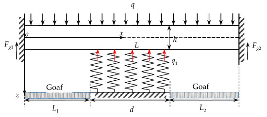 In Figure 6, q is the uniformly distributed load of the overlying strata above MKS (for the convenience of calculation, this includes the dead-weight of the MKS); h refers to the thickness of the rock beam; L represents the limited span of the rock beam; L1 and L2 are the distances between the fixed support at both ends and the two ends of the ICP, respectively; d stands for the width of the ICP; q1 is the reverse support load of the ICP on the overlying rock strata; and Fg1 and Fg2 are the concentrated reaction forces of the fixed support at both ends.