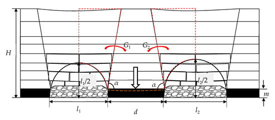 Before the mining on both sides of the ICP, the gravity stress of the overlying strata is the only stress source in the vertical direction, and the ICP, in a self-balanced state, will not undergo a deformation. With the mining on both sides completed, the ICP becomes an “island-like coal pillar”. The stress source above ICP changes from the gravity stress into the sum of the gravity stress and the transferred stress of the overlying strata in the goafs on both sides, which breaks ICP’s original self-balance. Under the influence of the new stress source, ICP will vertically generate a compressive deformation. According to previous studies [32,34,35], considering the relatively small subsidence coefficient in the mining area, the overlying strata are in the stage of insufficient mining after the first working faces of the two mining areas are extracted. Based on this, the mechanical calculation model of the stress transfer and the compression amount of the ICP under the condition of thick bedrock formation is established, as shown in Figure 7. Before the rock strata are fully exploited, the fracture height of the rock strata after mining is nearly one-half of the width of the goaf [19,23]. The overlying strata structures in the goafs are fully hanging, and the load transferred to the coal pillar is taken as one-half of the weight of the hanging strata [14,29,36]. Thus, the stress above ICP constitutes the transferred stress from the hanging strata and the gravity stress of the overlying strata. The angle α between the connecting line of the bottom of the goaf and the boundary of the moving zone of the strata and the horizontal plane is called the displacement angle of the strata.
