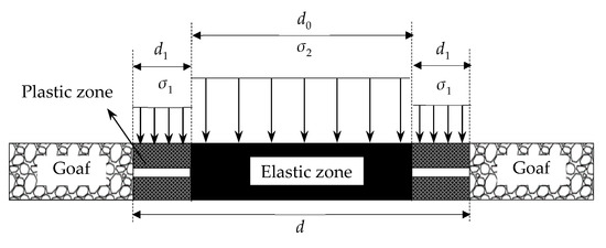 where m is the thickness of coal seam; is the compressive strain of the ICP in the vertical direction; E0 is the elasticity modulus of coal seam; and d0 is the width of the effective supporting zone of the ICP, which is obtained by the width of the ICP, d, minus the width of pressure-relief zones on both sides, d1.