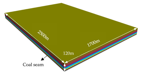 Based upon the geological conditions of the 2-2 coal seam in Yingpanhao Coal Mine, the characteristics of stress distribution and the compressive deformation after the mining on both sides of the coal pillar were simulated by means of FLAC3D. The size of the established model was 1700 m × 2500 m × 120 m, and the four sides were fixed by displacement constraints, At the top of the model, a uniform load was applied to simulate the 610 m thick overburden weight, conforming to the Mohr–Coulomb failure criterion [37,38,39,40]. In the model, the black group is the coal seam, as shown in Figure 9.