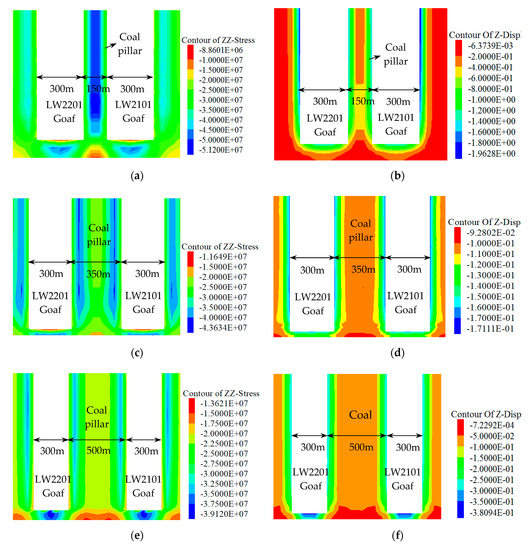 Figure 10 demonstrates the characteristics of vertical stress distribution and vertical compressive deformation of ICPs with different widths after mining on both sides. Figure 11 demonstrates the variation law of vertical stress distribution and compressive deformation amount of ICPs with different widths. It can be seen from Figure 10a,b that when the mining is started on both sides of the 150 m wide coal pillar, the maximum vertical stress above the coal pillar is 51.2 MPa, about 2.44 times the UCS of the coal body, and the minimum vertical compressive deformation is 0.364 m. According to Figure 11, it can be seen that the coal pillar has a high rockburst risk and probably induces MS. In the actual mining process, large-diameter pressure-relief boreholes were drilled along roadways on LW2201 and LW2101, which leads to a further increase in the concentrated stress above the coal pillar. This indicates that both OII rockbursts and MS will occur when the ICP width is less than 138 m. Figure 10c,d shows that after the mining on both sides of the 350 m wide coal pillar, the maximum vertical stress above the coal pillar is 39.8 MPa, equivalent to around 1.86 times the UCS of the coal body, and the large-scale vertical compressive deformation is 0.106 m, greater than the theoretical calculated value wmax. Here, the stress above the coal pillar cannot reach the condition of OII rockbursts; however, the deformation has exceeded the limited deflection of the MKS, and MS is easily induced. The results shown in Figure 10e,f suggest that after the mining on both sides of the 500 m wide coal pillar, the maximum vertical stress above the coal pillar is 34.2 MPa, nearly 1.63 times the UCS of the coal body, and the vertical compressive deformation is 0.062 m (wmax = 0.073 m > 0.062 m). Figure 11 shows that the condition of OII rockbursts is not satisfied, and MS does not exist either because the deformation amount is less than the limited deflection of the MKS. This verifies the correctness of the theoretical design basis.