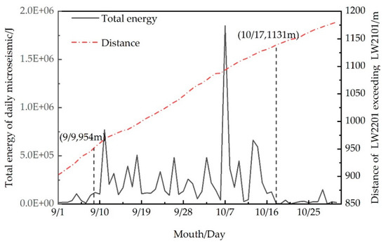 Figure 12 displays the relationship between the distance of LW2201 exceeding LW2101 and the daily change of microseismic energy from 1 September to 31 October 2018. It can be seen that the total microseismic energy before and after the mine seismicity on 7 October changed drastically; it kept a smooth rate of change from 1 to 9 September, but this rate began to increase significantly on 9 September until 17 October. It then started to decrease and tended to be stable. The total microseismic energy dramatically increased when the cutting point of LW2201 was 954–1131 m distant from that of LW2101. Analysis showed that this 954–1131 m range was just within the influencing scope of “a three-working-face square” composed of LW2201, LW2101, and ICP.