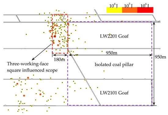 Figure 13 is the plane projection of microseismic events during the mining process from 1 September to 31 October 2018. The purple frame is the “three-working-face square” zone, and the red frame is the scope influenced by the “three-working-face square”. The comparison between the projections of the microseismic events on the LW2201 and LW2101 explains that more microseismic events were concentrated in the range of influence, and the large-energy events in this region were significantly more frequent than in other regions. It was proved that there was a “three-working-face square” effect after the mining on both sides of an ICP, which led to a higher concentration of stress above the coal pillar.