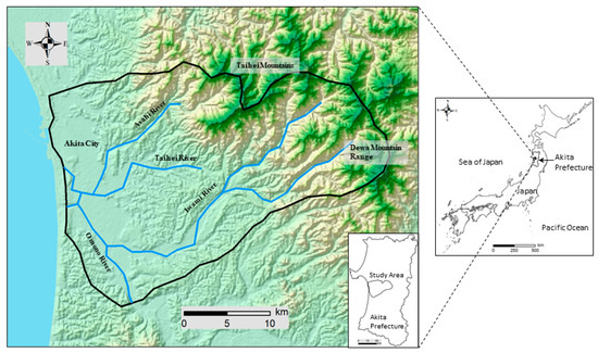 Akita Plain is situated in Akita Prefecture, the northern Japan (Figure 1). It is an alluvial plain with a dimension of about 16 km from north to south. It is surrounded by the Taihei Mountains and Dewa mountain range with more than 1000 m elevation in the east, Sea of Japan in the west and hills in the north and south. Quaternary alluvial deposits are transported mainly by Omono River and its tributaries flowing in the plain. Quaternary formations consist of sand, gravel, and silt. Its depth varies from 0 m in the surrounding mountains to around 100 m in the north-western lowlands. Tertiary formations consist of mudstones and siltstones [14].