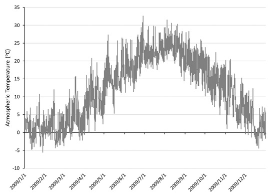 Room temperature was set as 22 °C for heating and 26 °C during cooling. Outer surface average heat transmission coefficient (U) and average solar heat acquisition rate (η) were taken as 0.75 and 0, respectively, for Akita City, based on the standard values set in the Energy Conservation Standard [15,16]. For atmospheric temperature, variation for the past 14 years observed in the Akita City was referenced from data published by Japan Meteorological Agency [19]. The average value of each year was calculated and the year which is close to the 14-year average was taken as a standard year for atmospheric temperature. The average value of the year 2009 was found close to the 14-year average. Hence, this year’s atmospheric temperature was selected as the standard values. Hourly variation of atmospheric temperature throughout a year was considered in the calculations of heating and cooling loads (Figure 2).