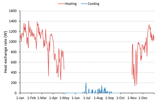Heating period was designated for 6 months from November to April and cooling period for 5 months from May to September. Operating mode of GSHP system was set in such a manner that heating starts once the atmospheric temperature decreases below 14 °C and cooling starts as the atmospheric temperature rises above 26 °C. Based on above mentioned scenarios, heating and cooling loads of the standard detached residence were calculated using Equations (1) and (2) (Figure 3). The heat pump was assumed to have a coefficient of performance (COP) of 3.5 for heating and 5.5 for cooling. These COP values are the typical averaged values for the GSHP used in the residences of Japan. Using calculated heating and cooling loads, and respective COPs of the heat pump, the amount of the heat exchange rate with underground required for heating and cooling of a detached residence was estimated (Figure 4).
