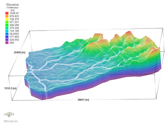 Groundwater flow and heat transport analysis was conducted for Akita Plain using a three-dimensional analysis model (Figure 5) to determine groundwater flow condition and temperature variation in underground formation. FEFLOW [20], a finite element program was used. The model boundary was set on water divides surrounding the plain, which is about 28.5 km long in north–south and 39.6 km long in east–west direcions.