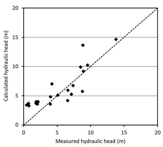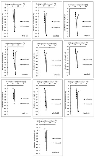 Verification of the analysis model was performed by comparing measured hydraulic heads and vertical temperature distribution of existing wells (Figure 6 and Figure 7) with their corresponding calculated values. Groundwater levels and vertical temperature profiles measured by Uchida et al. [12] were used in this verification. Groundwater levels were measured at 22 existing wells and vertical temperature profiles were measured at 10 existing wells. Comparison between measured and calculated hydraulic heads of is shown in Figure 8. There were some discrepancies in a few wells, however, overall agreement between calculated and measured values were satisfactory. Also in the case of vertical temperature distribution, measured and calculated values agreed well, showing good consistency (Figure 9). Groundwater temperature at shallow depths are readily affected by variation in atmospheric temperature. Due to this, calculated and measured values did not match well at the upper part of the existing wells, but the temperature profiles fitted closer with the well depth at almost all of the observation points. Therefore, it can be said that the analysis model reflected the natural groundwater flow system in the Akita Plain reasonably well.