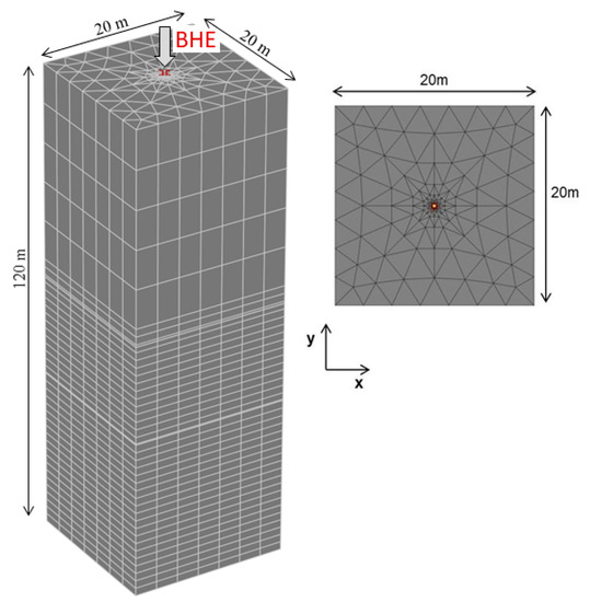 The model top and bottom were set as impermeable. Model sides were assigned with hydraulic heads resulted at the selected points of BHE models in the analysis model (Figure 5). For temperature analysis, top and bottom of BHE models were fixed with temperature values resulted from the analysis model. Vertical meshes of BHE models were set at 10 m intervals up to 50 m depth. From 50 to 120 m depth, the vertical meshes were divided by 2 m intervals so that BHE depths can be varied a few meters during numbers of heat exchange simulations.