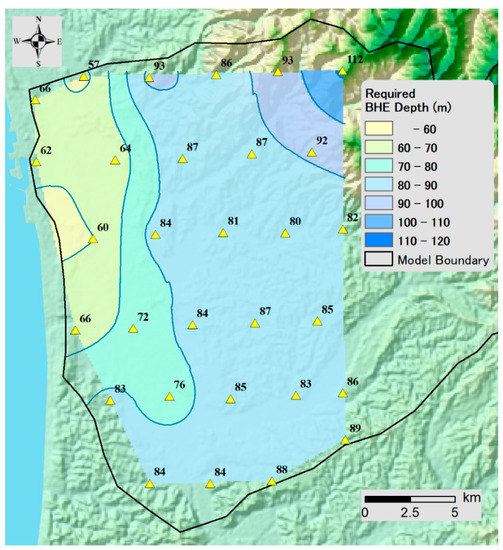 To calculate the required BHE depths and estimate suitable areas, identical BHE models were constructed at 30 points in the plain. The number of simulations of heat exchange with the underground was conducted at each point with the calculated heat exchange rates as model inputs, and the inlet and outlet temperature of the BHE were obtained as outputs. Then, the required depth of BHEs were confirmed at each point such that the average of inlet and outlet temperatures of BHE does not go below −2 °C. A distribution map of required BHE depths was prepared as a suitability map.