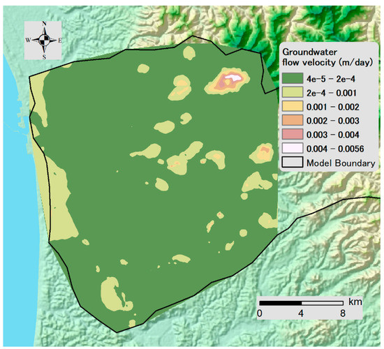 It has been found that the apparent thermal conductivity of underground becomes higher with faster groundwater flow velocity, due to groundwater advection effect. This in turn enhances the heat exchange performance of BHE resulting in shorter BHE depths [5,26,27,28,29]. However, the groundwater flow velocity calculated from the analysis model in Section 4 was determined to be very slow in the Akita Plain. Variation of groundwater flow velocity in the plain is shown in Figure 12. These values are the average of groundwater flow velocities up to 100 m depth from ground surface. Lower flow velocity is considered to be because of lower hydraulic gradients. Niibori et al. [30], Uchida et al. [7], and Kimura [31] reported that groundwater flow velocity slower than 1 × 10−5 m/s has negligible influence on the increment of heat exchange rates of BHE. As the flow velocity within the Akita Plain is lower than 1 × 10−5 m/s, its influence on the required BHE depth seems to be minimal.