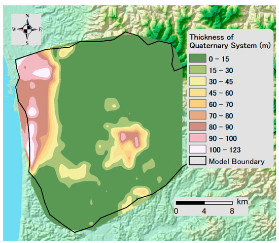 From geological data, Quaternary System was found to be very thickly distributed in the north-western coastal lowland with thickness up to 100 m (Figure 13). The thermal conductivity of Quaternary System in the Akita Plain is higher than that of Tertiary System. Therefore, in the area where there is thicker Quaternary System, the heat exchange efficiency of BHE is higher. It thereby can contribute to shorter BHE depths. Hence, it was concluded that the shorter BHE depths at the north-western areas was because of thicker Quaternary alluvial deposits and higher thermal conductivity.