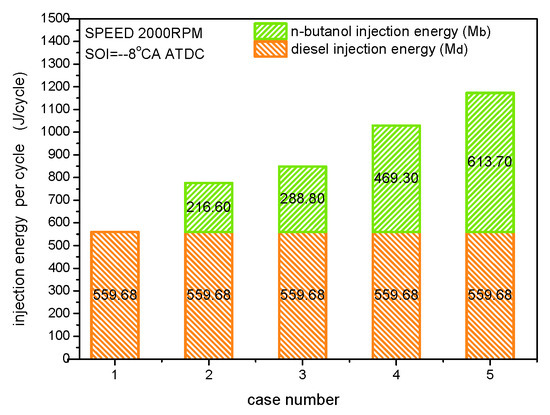 After the engine was warmed up until the lubrication oil and coolant fluid temperature were 85 °C, the engine speed was set to 2000 rpm in traditional diesel combustion mode for background data. Then the port injector was used to inject low reactivity fuel (n-butanol). Meanwhile, the diesel injection quantity and injection timing were maintained constantly. The diesel and n-butanol injection quantity in each case are shown in Figure 2.