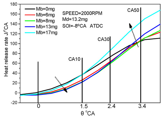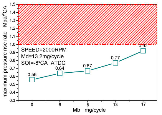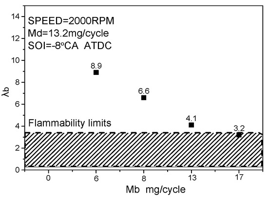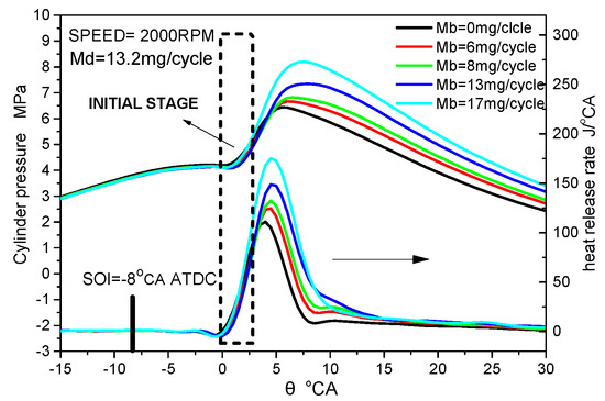 It can be seen that, under the conditions that Mb ≤ 13 mg/cycle, adding n-butanol can suppress the initial heat release from dual-fuel combustion, which results in the reduction in the accumulated heat release within a specific time interval at the early stage of engine heat release. Under the conditions that Mb > 13 mg/cycle, adding n-butanol can help to increase initial heat release of dual-fuel combustion. In addition, when n-butanol injection quantity is 17 mg/cycle, the engine’s maximum pressure rise rate is the highest (about 1 MPa/°CA) compared with other cases, which is because of the higher heat release rate. It may cause the pre-ignition of the premixed n-butanol/air mixture [23,32]. This can also be revealed in Figure 5 that, when Mb ≤ 13 mg/cycle, the excess air coefficient is higher than the flammability limit, so the heat release rate decreases as the injected butanol increases. When Mb > 13 mg/cycle, the excess air coefficient is lower than the flammability limit, leading to obvious flame propagation.