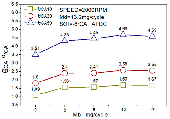 During the period when θ∈ (1.5, 2.4) °CA and Mb ≤ 13 mg/cycle, the rising slope of the heat release rate curve is increased and is higher than that of the pure diesel combustion with increasing n-butanol injection quantity. It shows a trend that the effect of the premixed n-butanol fuel on diesel fuel heat release will experience a transition stage when the n-butanol injection quantity is changed. It can be seen from Figure 5 that most experiment conditions with different n-butanol injection quantities did not reach the flammability limit (except for the case with 17 mg/cycle of n-butanol injection quantity), indicating that the combustion process of n-butanol/air mixture is mainly premixed combustion. Although the premixed n-butanol/air mixture is not rich enough to spread the flame, the high temperature reaction zone with premixed n-butanol/air mixture keep becoming larger as the in-cylinder instantaneous temperature increases. Besides, as concentrations of premixed n-butanol increases, the flame propagation goes faster, which accelerates the heat releasing and offset the impact of suppression to the heat release [30,31].