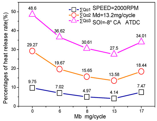 The accumulated heat release rate starting from SOI to α under conditions with dual-fuel combustion are calculated. According to Figure 7, the three ∑Qα1, ∑Qα2, ∑Qα3 decrease as the injected n-butanol increases until 13 mg/cycle and increase as the injected n-butanol increases.