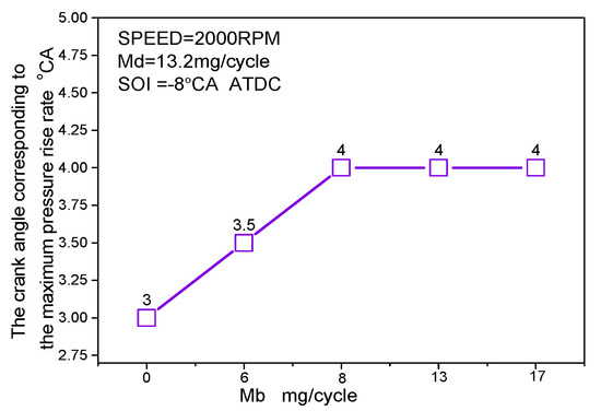 Figure 9 shows the crank angle corresponding to the maximum pressure rise rate under the different concentrations of premixed n-butanol. The maximum pressure rise rate appears when the piston moves downward. When Mb ≤ 8 mg/cycle, the crank angle corresponding to the maximum pressure rise rate will be more retarded with the increase of the n-butanol injection quantity. With the increase of the n-butanol injection quantity, the suppression effect on the heat release rate of the dual-fuel combustion may be amplified. Moreover, when Mb > 8 mg/cycle, the crank angle corresponding to the maximum pressure rise rate fixes at 4 °CA ATDC (after top dead center). It indicates that there may be a balanced relationship between the amount of the fuel and the maximum pressure rise rate. The more fuel is injected, the more time it will take for the n-butanol/diesel dual-fuel combustion to become faster.