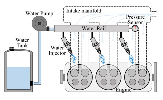 The water used for the experiments was de-ionized distilled water stored in a tank at 25 °C. A recirculating pump delivered water at a pressure of 6 bar to the rail, which in turn was connected to three injectors, which were located in the intake runners, one for each cylinder.